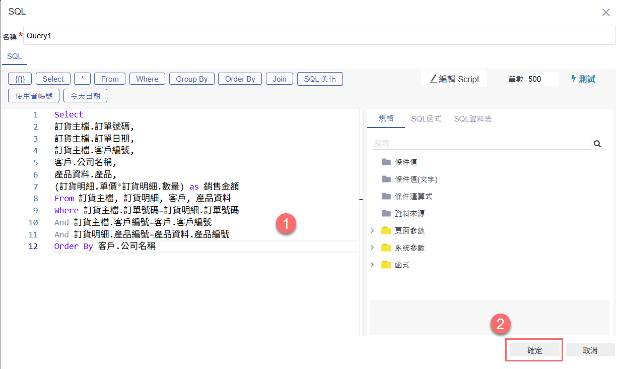 在 SQL 編輯畫面中輸入查詢語法,範例如圖為依據「客戶」與「產品」資料,計算銷售金額的彙總查詢。SQL 撰寫完成後,點選右下角「確定」,儲存查詢設定,作為後續群組加總的依據資料集。