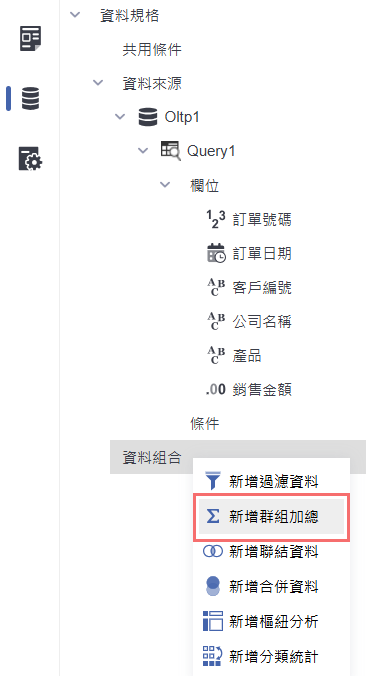 在「資料來源」中,點選「資料組合」區塊右鍵,選擇「新增群組加總」,以建立依指定欄位分組並彙總數值的資料集。