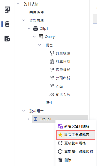 群組加總設定完成後,於「Group1」資料組合上點選右鍵,選擇「設為主要資料表」。此操作會將群組加總後的結果作為查詢設計的主要資料來源,確保畫面呈現的是加總後的資料內容。