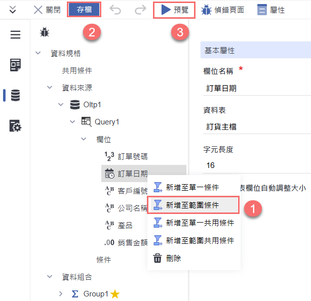若需依「訂單日期」進行查詢篩選,可於該欄位右鍵選擇「新增至範圍條件」,系統將自動建立可調整日期區間的查詢條件。 完成條件設定後: 點選上方的「存檔」儲存目前設定 再點選「預覽」,即可查看依照篩選條件與群組加總邏輯呈現的查詢結果畫面