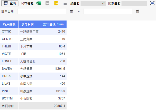 完成設定後,在預覽畫面中可以看到查詢結果已依「客戶編號」與「公司名稱」進行分組,並顯示加總後的「銷售金額_Sum」欄位值。若有設定篩選條件(例如訂單日期),也可透過查詢欄位輸入條件進行篩選。
