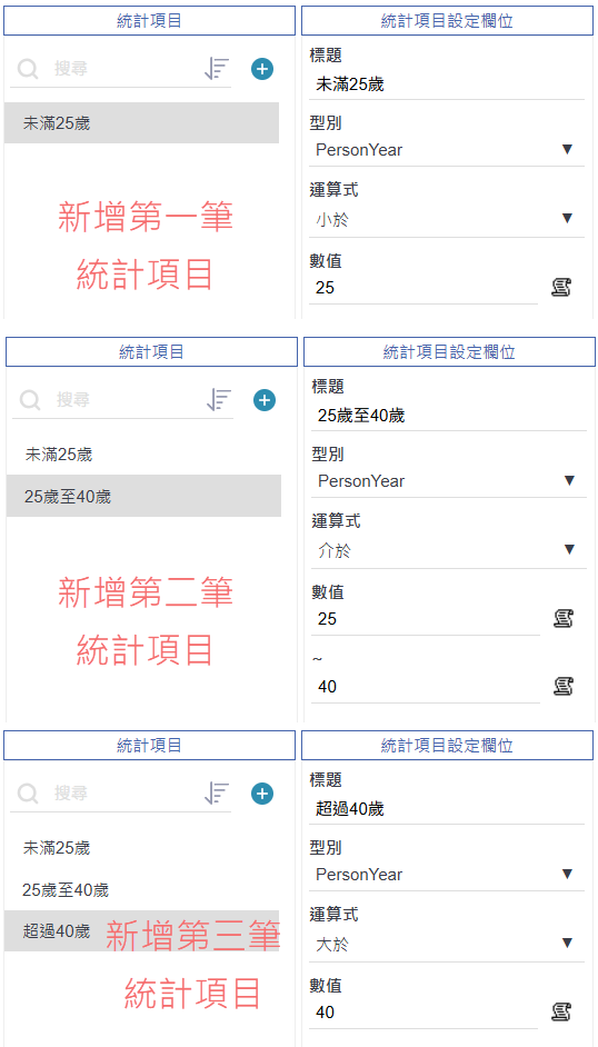 依據年齡區間新增三筆統計項目,分別定義為「未滿25歲」、「25歲至40歲」、「超過40歲」,並透過欄位 PersonYear 搭配不同運算式條件(小於、介於、大於)設定對應的數值範圍,完成分齡統計的條件分類。