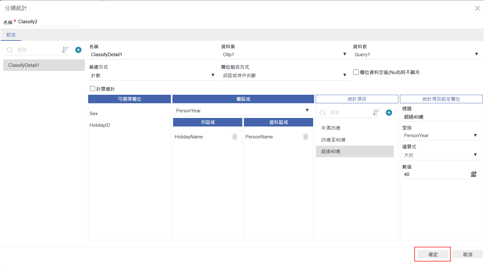 完成三筆統計項目的設定後,點選畫面右下角的「確定」,儲存本次分類統計條件的設計內容。