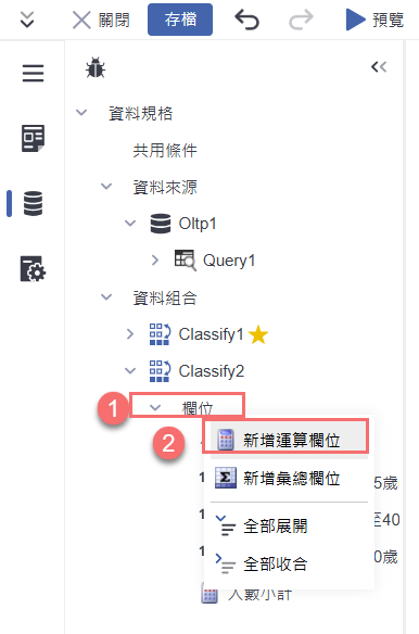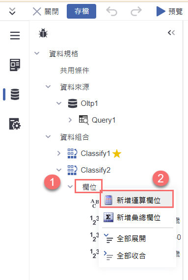 在「分類統計」節點下點選「欄位」,按右鍵選擇「新增運算欄位」,開始建立自訂計算欄位。