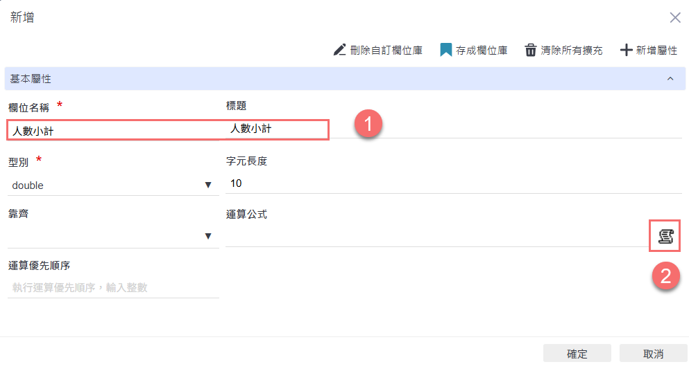 在新建運算欄位的畫面中,設定欄位名稱與標題為「人數小計」,型別選擇 double,接著點擊右側的公式編輯按鈕,進行運算公式的設定。
