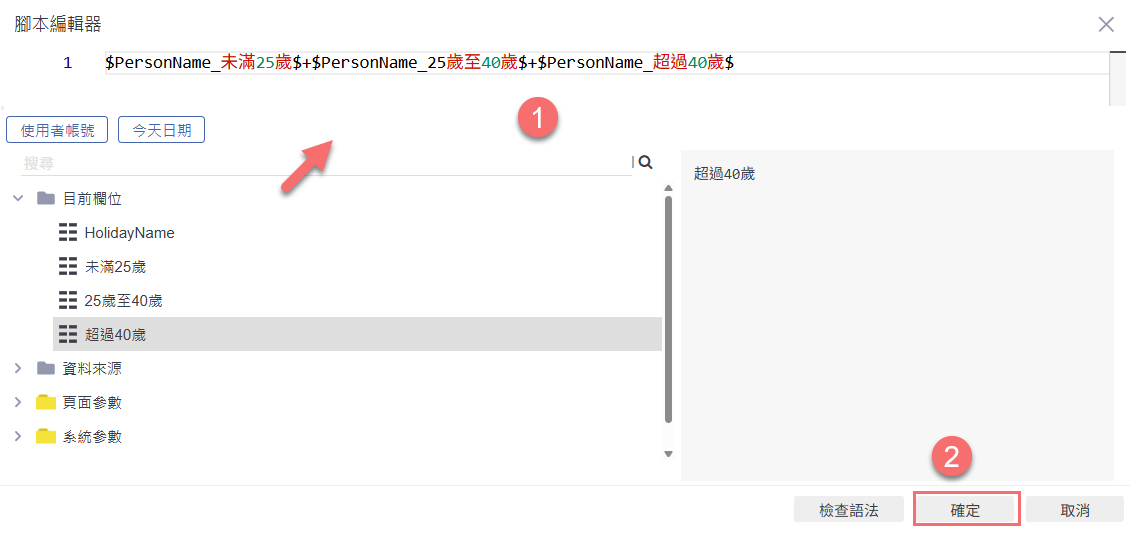 在公式編輯器中,點擊輸入「未滿25歲」、「25歲至40歲」與「超過40歲」這三個統計項目的變數並用「+」號加總起來,完成後點擊「確定」儲存公式內容。