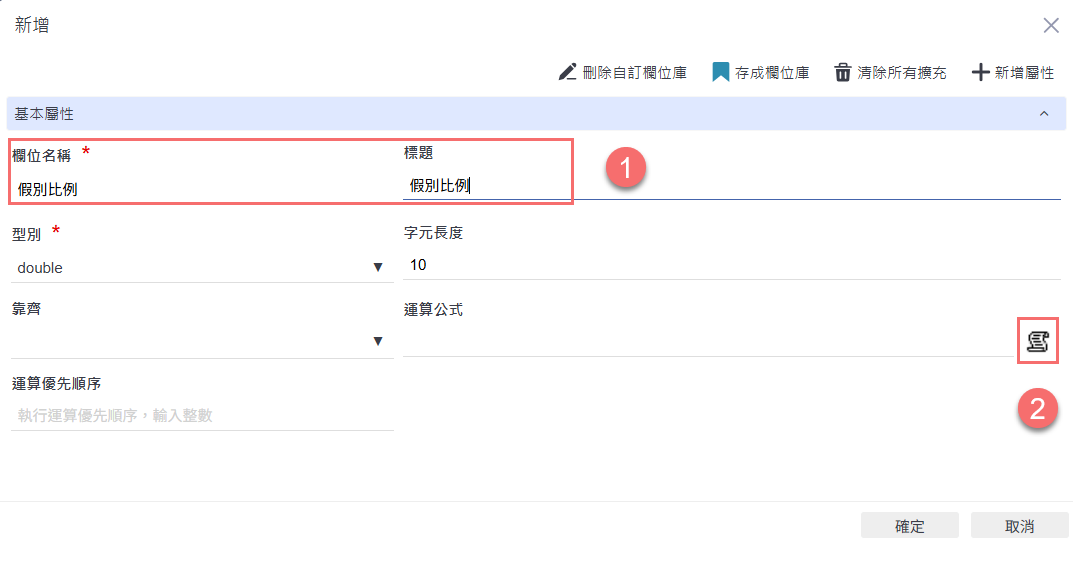 在新增運算欄位的設定畫面中,輸入欄位名稱與標題為「假別比例」,接著點選右側的公式編輯器按鈕,準備撰寫計算公式。