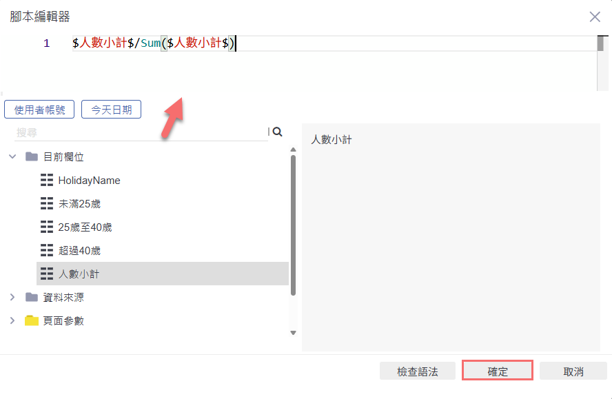 在公式編輯器中,輸入 $人數小計$ / Sum($人數小計$) 的計算式,設定將每筆人數小計除以總人數小計,以取得各分類的比例,輸入完成後點選「確定」儲存公式。