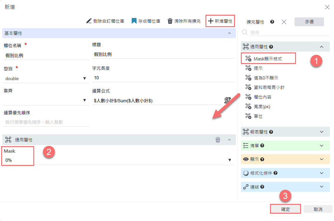 點選「+新增屬性」,在點選「通用屬性」中新增 Mask 顯示格式,將 Mask 設定為「0%」,讓假別比例的結果以百分比格式呈現,設定完成後,點選「確定」儲存欄位設定。