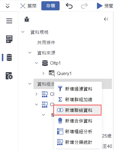 在「資料組合」上點選右鍵,選擇「新增聯結資料」,即可開始設定資料表之間的 Join 關係。