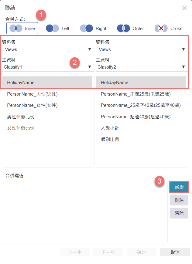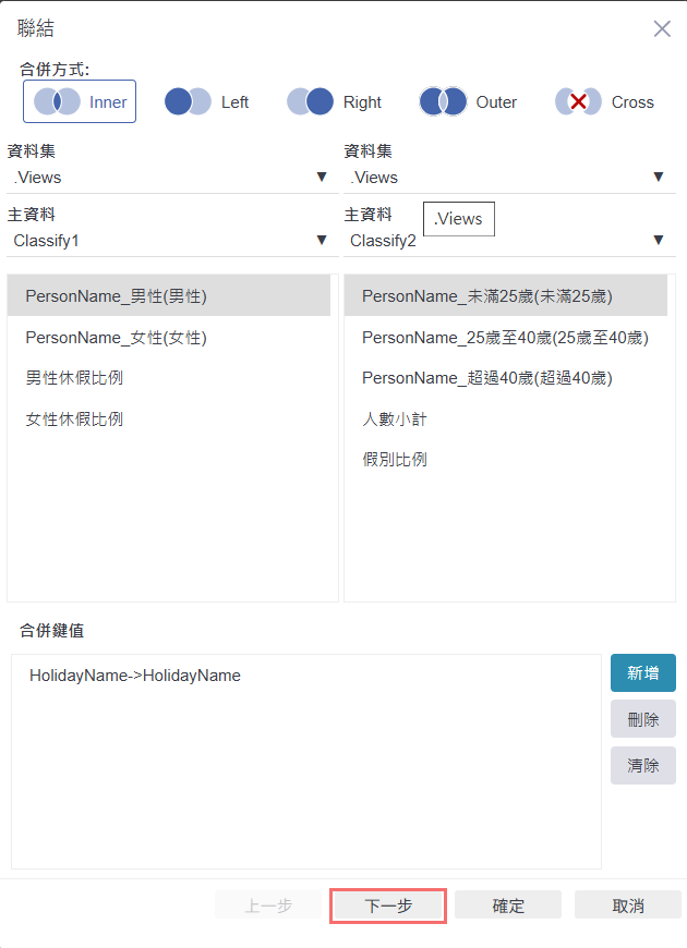 在聯結設定畫面中,選擇「Inner」作為合併方式,接著指定要聯結的兩個資料表(如 Classify1 與 Classify2),並在下方點擊「新增」,選取雙方對應的鍵值欄位(如 HolidayName),即可完成基本的 Inner Join 設定。