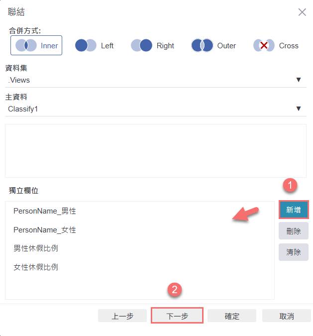 進入聯結欄位設定後,點選右側的「新增」來挑選主資料表中要保留的欄位,選擇完成後再按下「下一步」繼續設定流程。