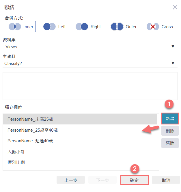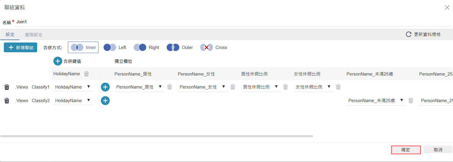 確認「合併鍵值」與「獨立欄位」設定無誤後,點選右下角的「確定」,完成資料聯結(Inner Join)設定。