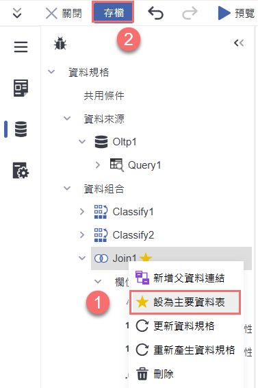 在「Join1」資料組合上點擊右鍵,選擇「設為主要資料表」後,再點選上方工具列的「存檔」按鈕,即可完成資料聯結設定的儲存。