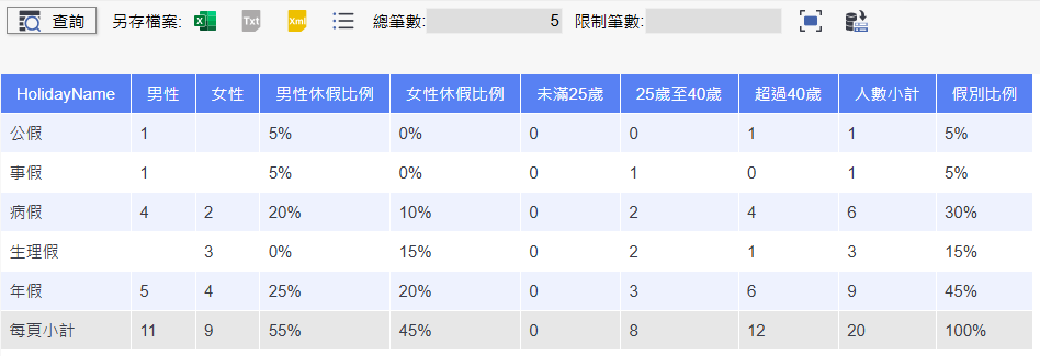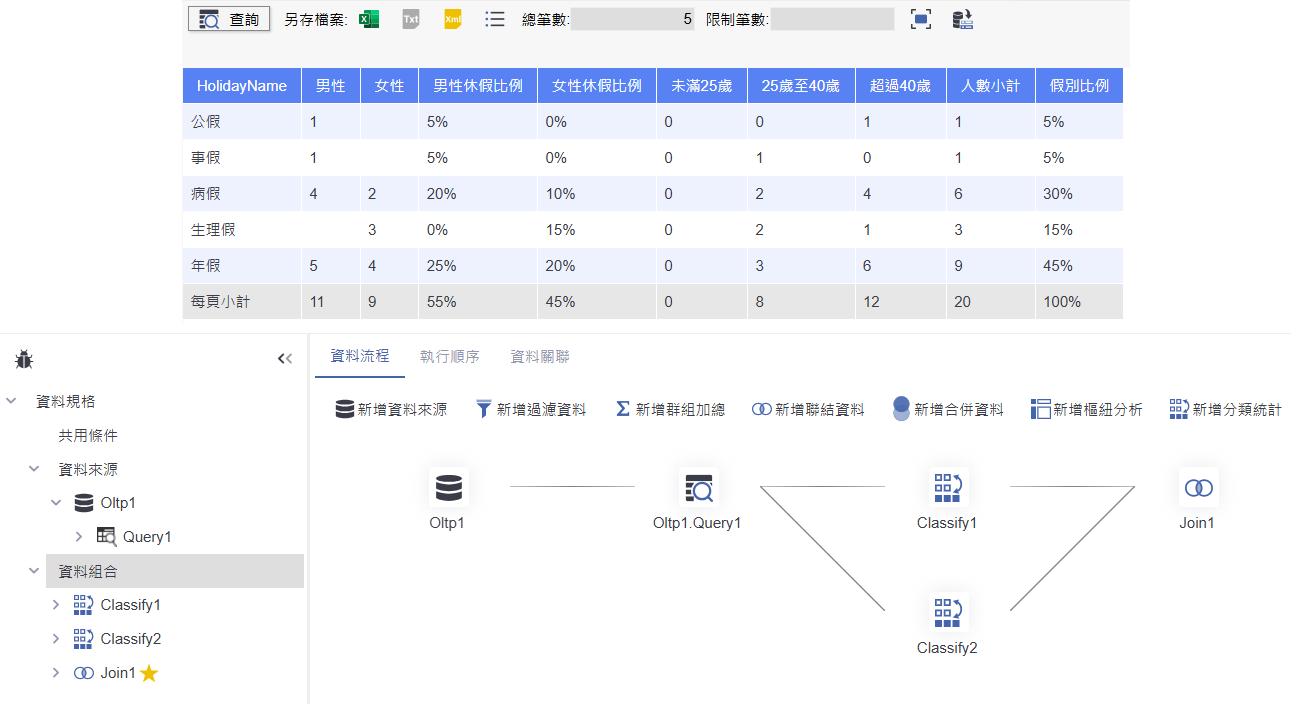這張圖表呈現的是「聯結資料」後的結果,透過 Inner Join 將兩筆不同來源的資料進行鍵值對應整合,成功結合性別與年齡區間的統計資料。畫面中顯示每種假別對應的男、女人數與其休假比例,同時也彙整出不同年齡區間(未滿25歲、25歲至40歲、超過40歲)的人數統計,最右側則為每種假別的人數小計與比例,完整呈現資料整併後的結果。