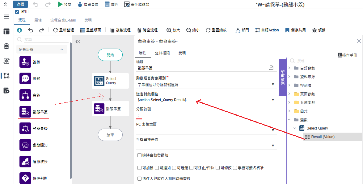 將左邊 action [動態串簽]拖拉到右邊流程中,必須放在SelectQuery的下方,並設定動態串簽的內容 (如果沒下一關卡,系統就會認為結案)