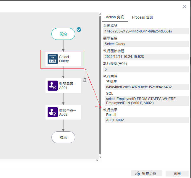 將左邊 action [SelectQuery]拖拉到右邊流程中,選擇資料庫+輸入sql語法,取得userid的資料