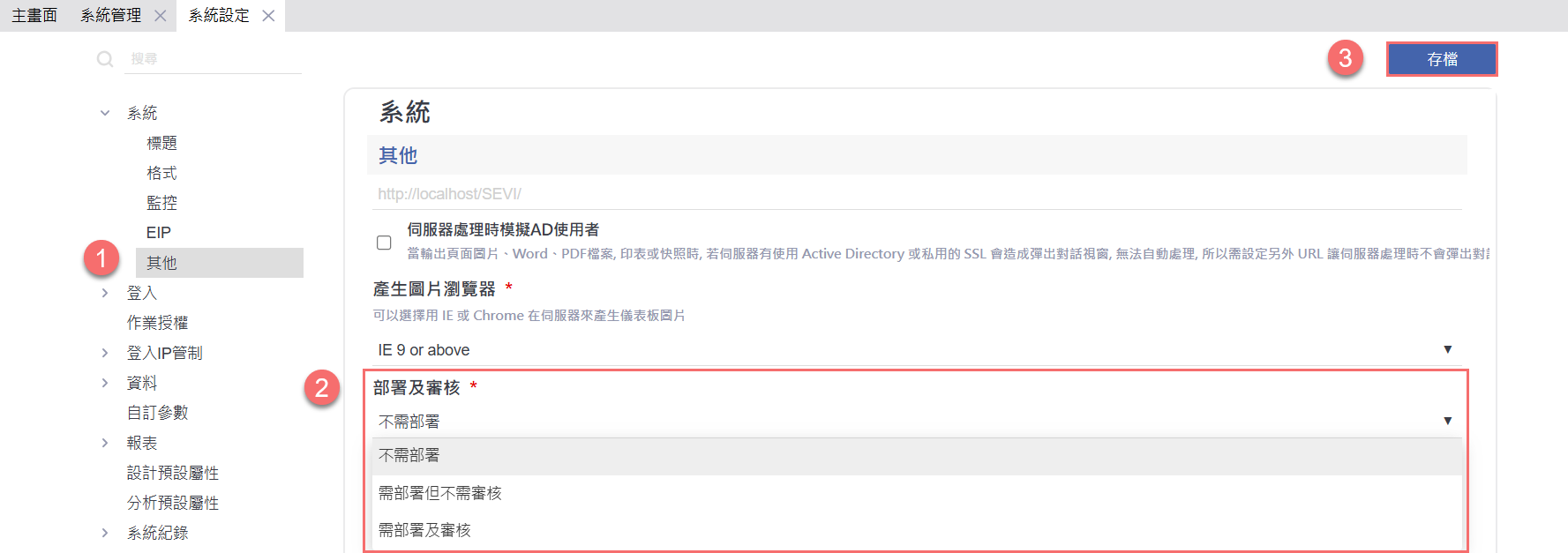 若需啟用「部署」或「審核」功能,可依下列步驟於系統管理中進行設定:
