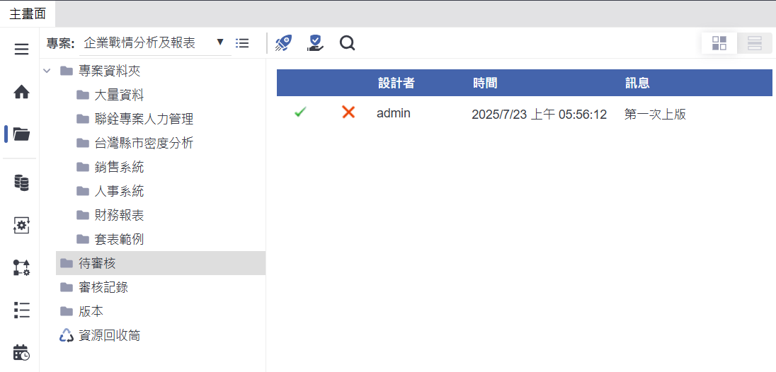 進入待審核,審核通過或退回:部署送出後,系統會將資料顯示在左側的【待審核】資料夾中。審核人員可在這裡查看部署資訊,包括設計者、時間與訊息說明。若內容無誤,可點選 ✔ 通過,讓頁面正式上線;如有問題,也可點選 ✖ 退回,退回後原頁面版本將不變,需重新調整後再部署一次。