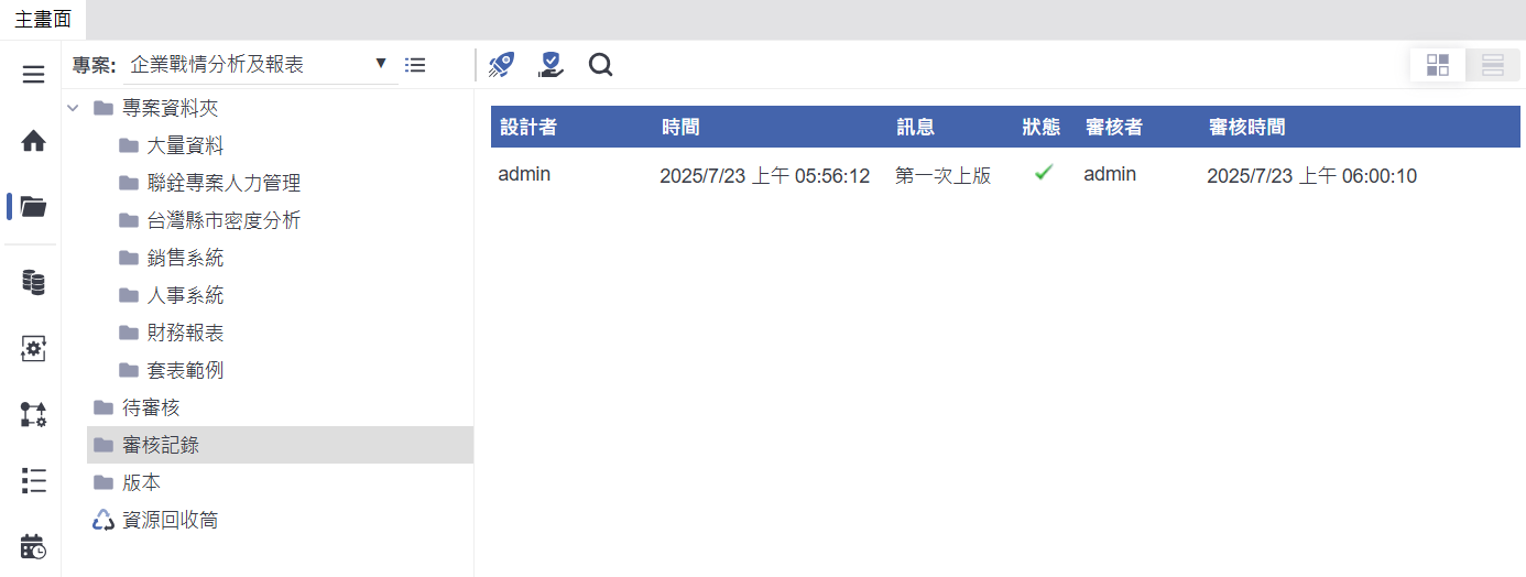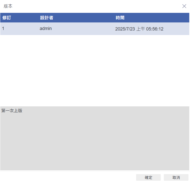 查看版本紀錄,掌握每次修改內容:透過「版本」功能,使用者可以清楚查看每一版的修訂紀錄,包括設計者名稱、修改時間與備註訊息(如「第一次上版」)。這有助於團隊成員追蹤報表的歷程變更,確保版本一致性,也便於日後回溯查詢與版本管理。