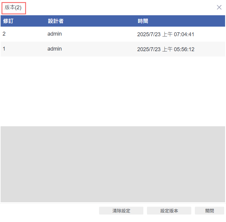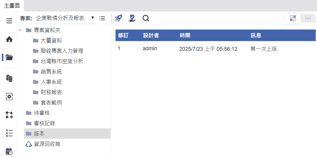 確認版本資訊以追蹤修改紀錄:於【版本】頁籤中,可查閱每次部署的版本紀錄,包括修訂次數、設計者、時間與訊息說明。透過版本管理功能,能有效掌握報表或專案的演進歷程,方便日後進行比對、回溯與版本控制。