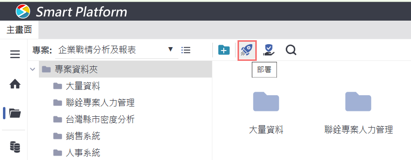 點選部署按鈕:在主畫面中,先選取欲上版的專案資料夾,接著點擊上方工具列中的【部署】圖示(火箭符號)。這個按鈕代表將目前設計完成的頁面送出進行部署流程,後續可進入審核與版本管理階段。