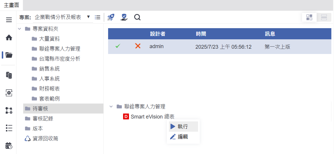 執行與編輯功能說明(待審核狀態):部署後的報表即會顯示於【待審核】資料夾中,即使尚未通過審核,使用者也可以直接點選頁面名稱,進一步選擇「執行」以預覽報表內容,或選擇「編輯」進行後續調整。這樣的設計可讓使用者在報表正式上線前,即時檢視與修正內容,提升整體作業效率與準確性。
