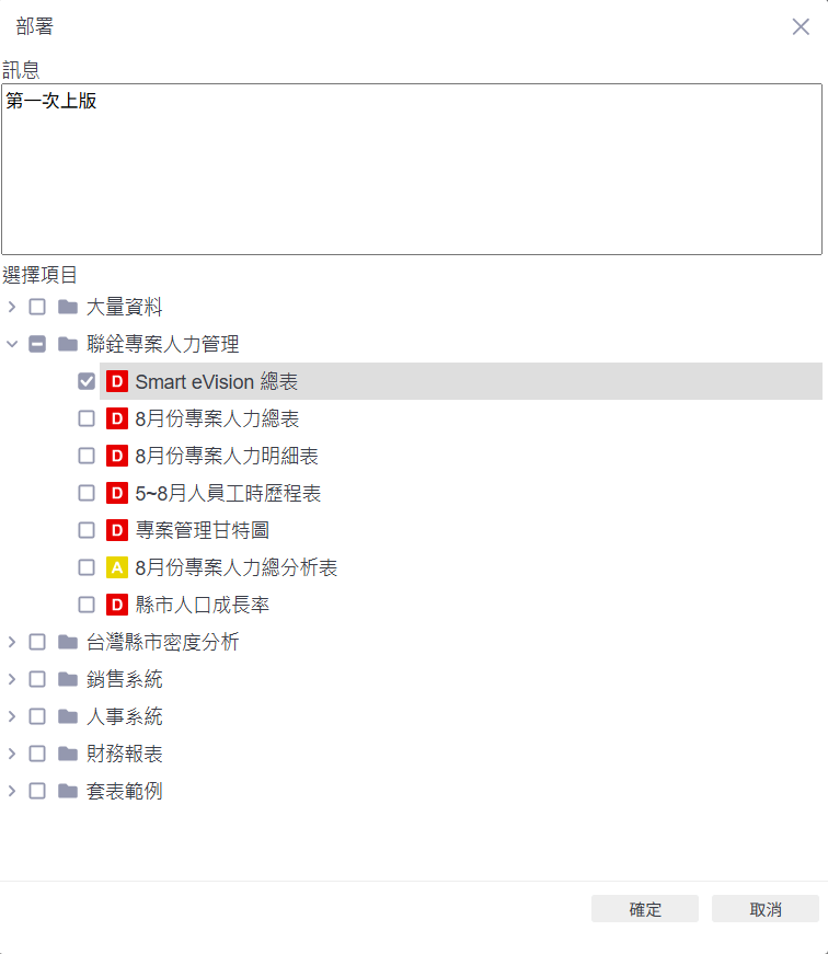 填寫部署訊息並勾選要上版的頁面:開啟部署視窗後,請在上方「訊息」欄位填寫此次部署的說明(例如:「第一次上版」),方便後續查詢記錄。接著,在下方頁面清單中勾選要一起部署的頁面,確認無誤後,點選右下角的【確定】即可送出部署申請。系統將進入審核流程。