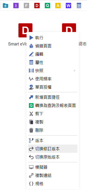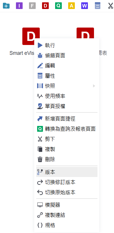在頁面圖示上按滑鼠右鍵,點選【版本】進入版本管理畫面。這裡可針對不同版本進行切換、修改,或設定僅限特定使用者執行該版本。這樣的功能可用於測試或限定內部人員預覽新版內容,避免尚未審核完成的設計被廣泛使用。