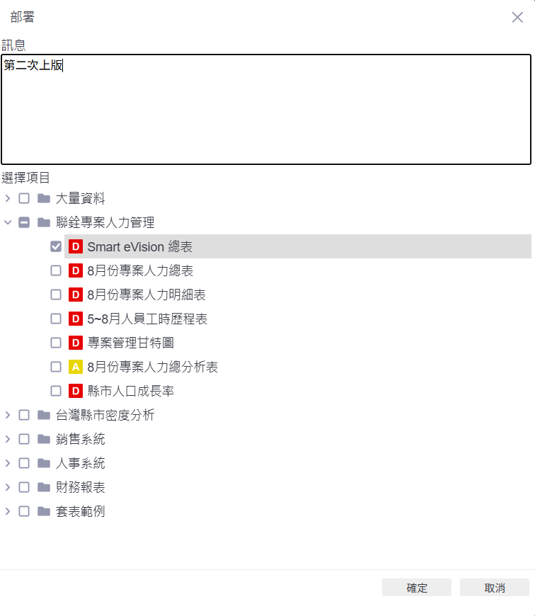 提交新版本部署說明:當頁面內容編輯完成後,使用者可透過部署畫面將頁面上傳為新版。於畫面中輸入版本訊息(例如「第二次上版」),並勾選欲部署的頁面項目,點選「確定」即可送出審核程序。這項流程有助於記錄每次上版的變更說明,方便團隊成員理解異動內容與追蹤歷程。