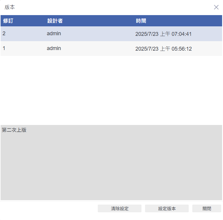 進入【版本】畫面後,選取欲指派的版本(例如:第二次上版),再點選右下方的【設定版本】按鈕。接著可進一步設定只有指定使用者能看到或執行該版本。這個功能常用於內部測試、預覽或讓主管先行審閱,確保尚未正式釋出的版本不會影響其他使用者。