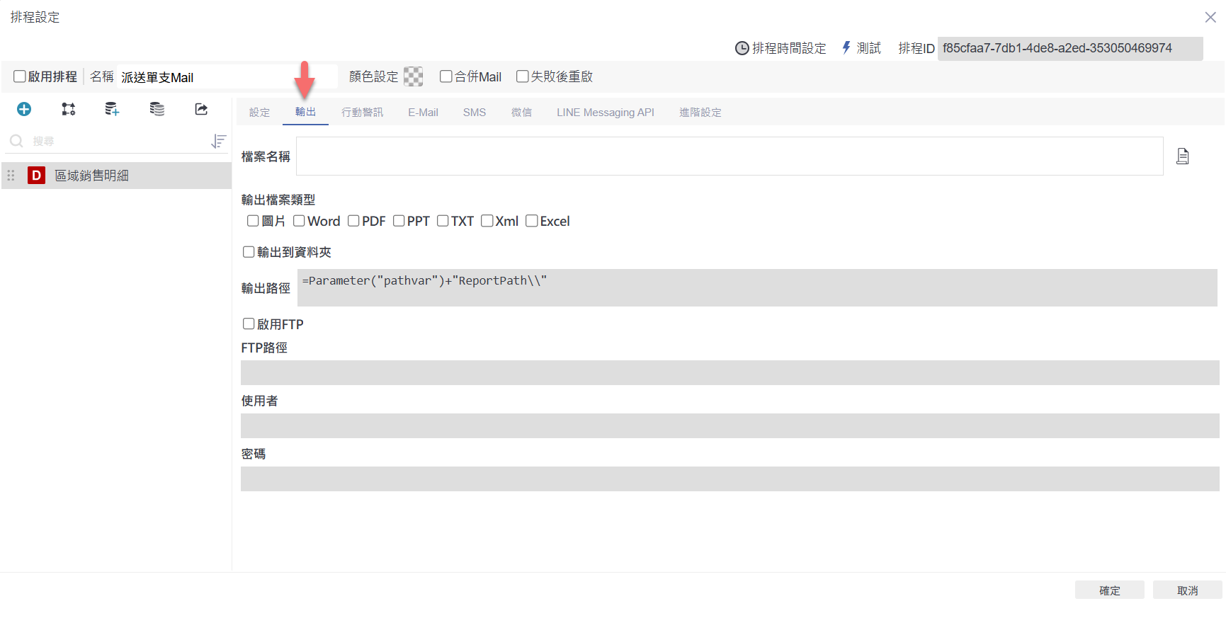 輸出路徑:指定檔案存放的完整路徑,可搭配參數(如=Parameter("pathvar") + "ReportPath\\")動態產生。