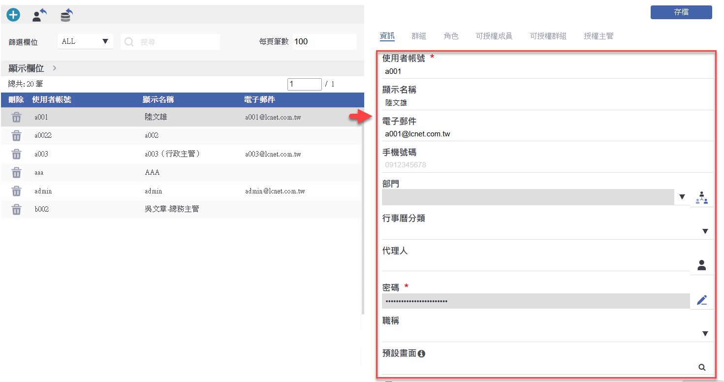 管理員可在此頁面檢視、編輯或刪除使用者帳號。左側為組織樹(來自組織管理模組),右側顯示對應部門的使用者清單與詳細資訊。