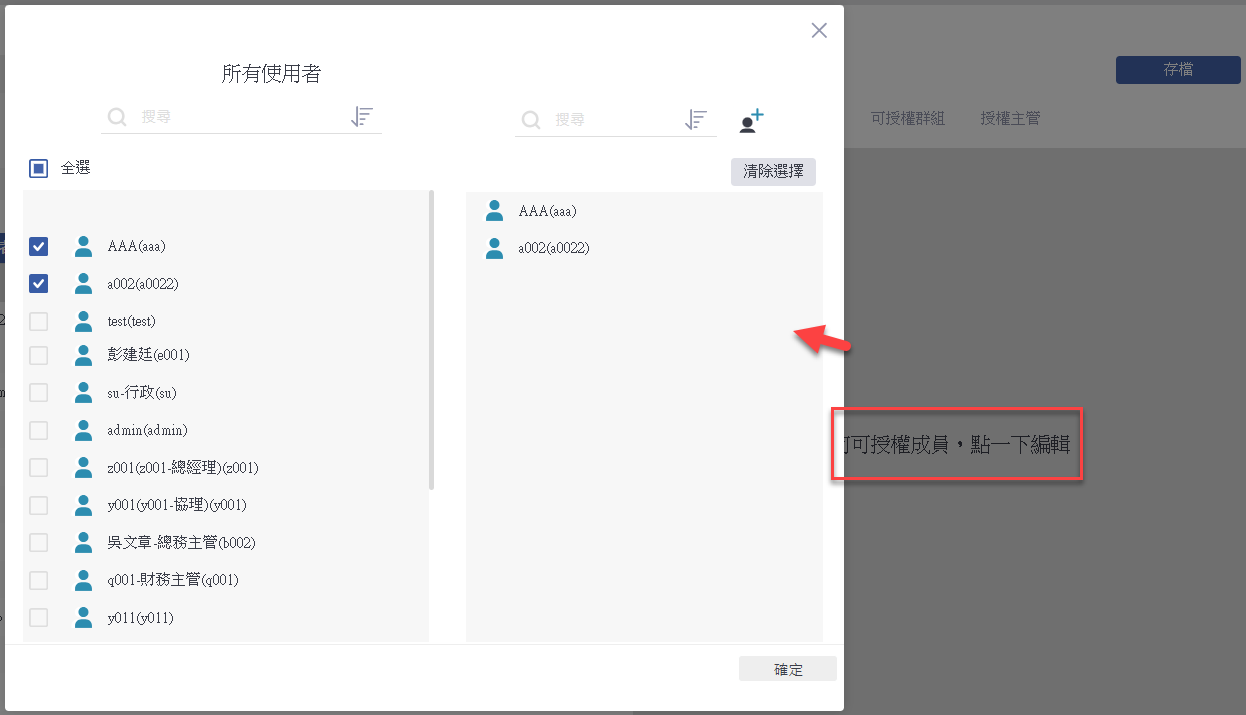 在清單中,您可以透過勾選的方式,選取多個使用者,完成選擇後,點擊右下角的「確定」,即可將所選使用者加入使用者清單。