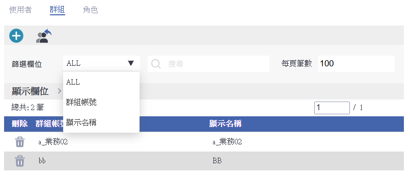 篩選欄位:您可以從下拉選單選擇篩選條件,例如使用者帳號或顯示名稱,並輸入關鍵字後點擊放大鏡進行搜尋。