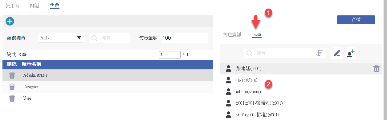 可依系統需求建立多種角色,並分配給不同使用者設計、瀏覽或管理等權限,以利權責分工與日常作業管理。