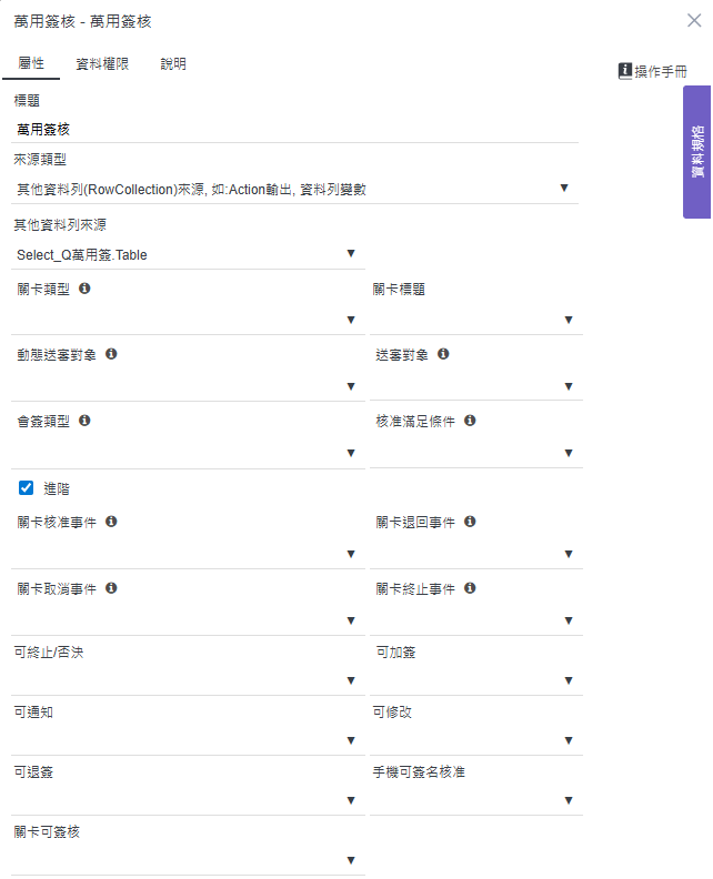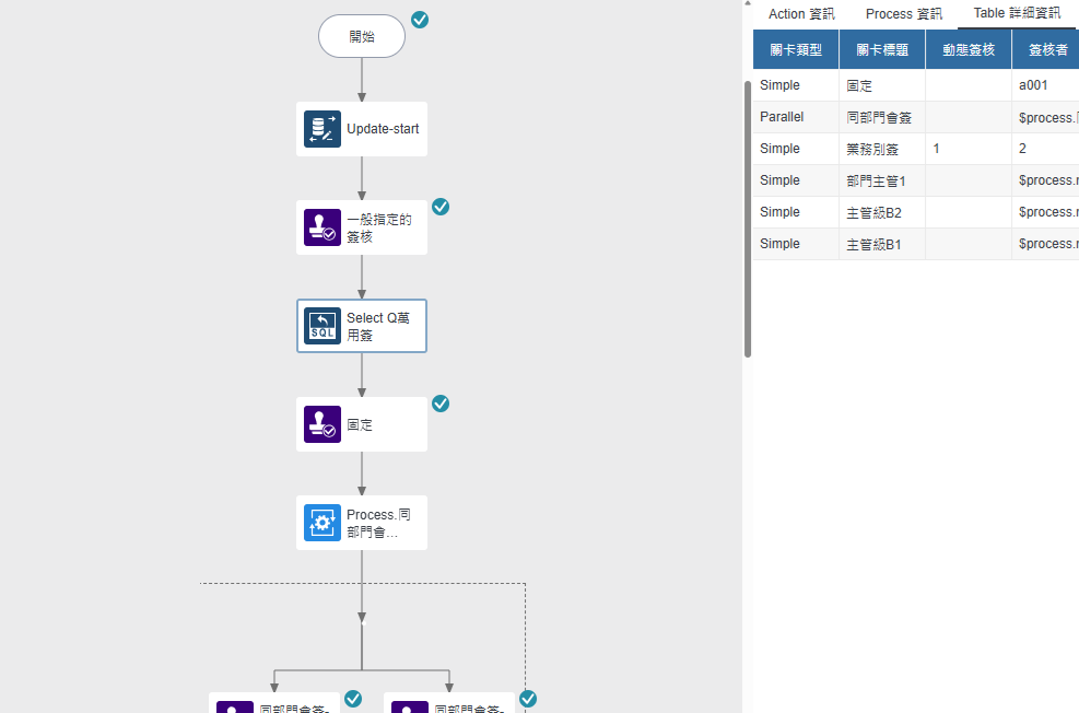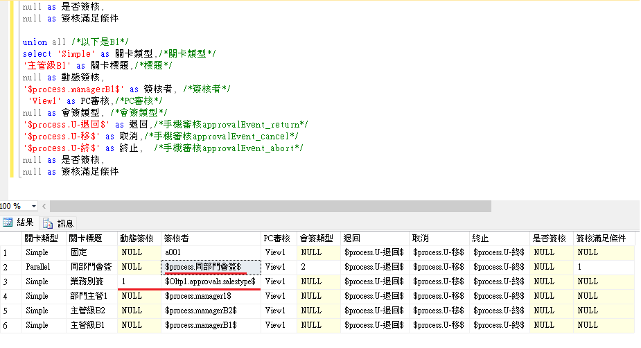 關卡類型=Parallel(會簽),需搭配會簽類型及滿足條件設定, $process.同部門會簽$ 簽核者=$process.同部門會簽$ ,系統認字串$process.$ 會執行頁面actios的Name的執行結果作業簽核人員 簽核者=$Oltp1.approvals.salestype$ ,需搭配動態簽核=1,系統才會判斷額外進行Script解析處理,取得$資料來源.資料表.欄位名稱$,如果動態簽核未指定,全部當作固定字串處理 |