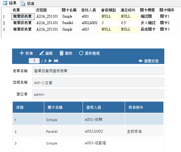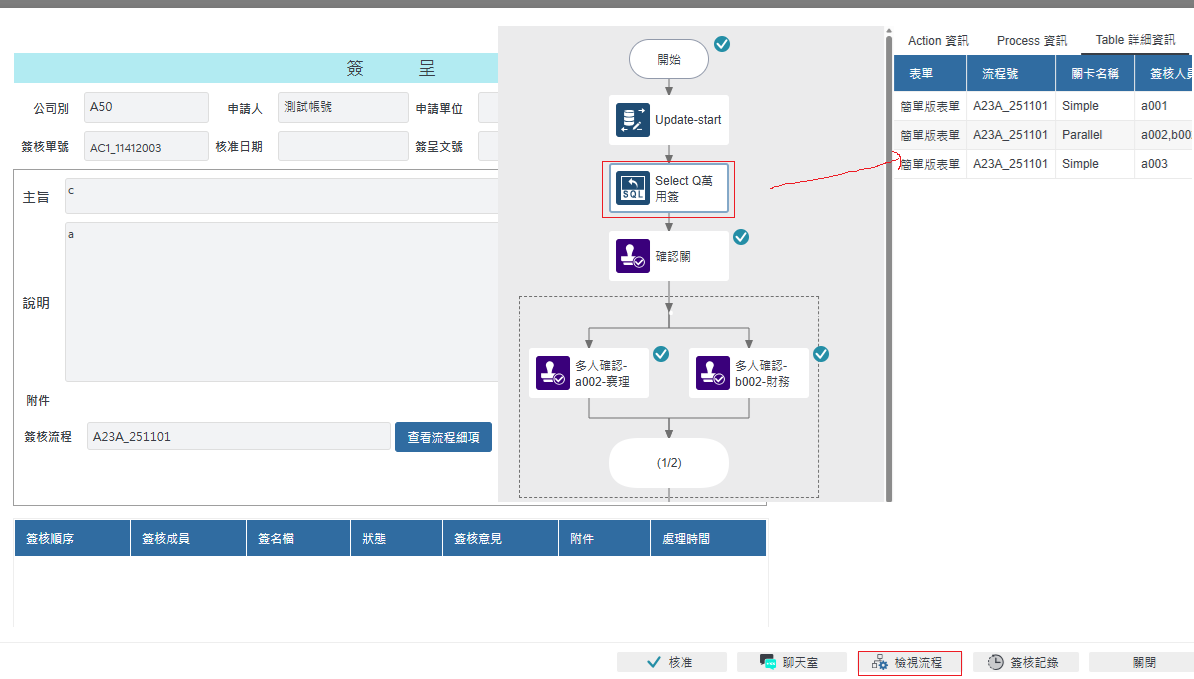 實際新增資料進行送審後在第一關卡核准後,可點選[檢視流程],查看到SelectQuery的結果搭配實際送簽的效果