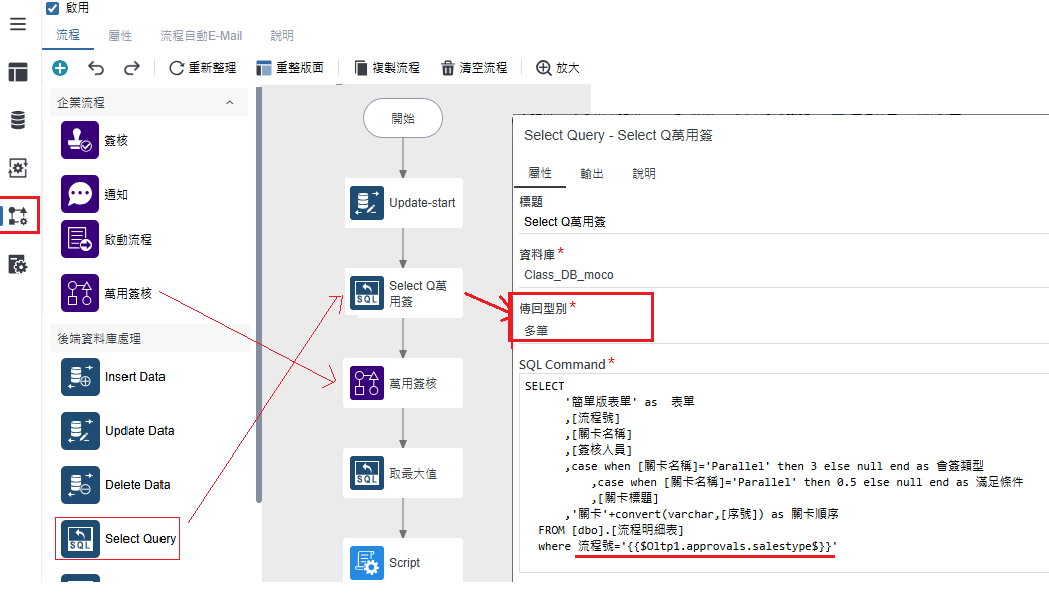 在輸入頁面表單的企業流程中,拖拉[SelectQuery] action到流程上,將傳回型別設為多筆,並輸入第一步的SQL語法,取得流程會用到的資料
