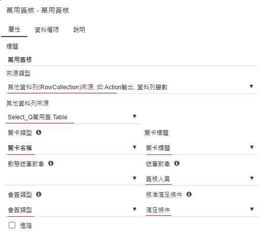 設定[萬用簽核] action,選擇select query的結果欄位,並指定到萬用簽核的設定上