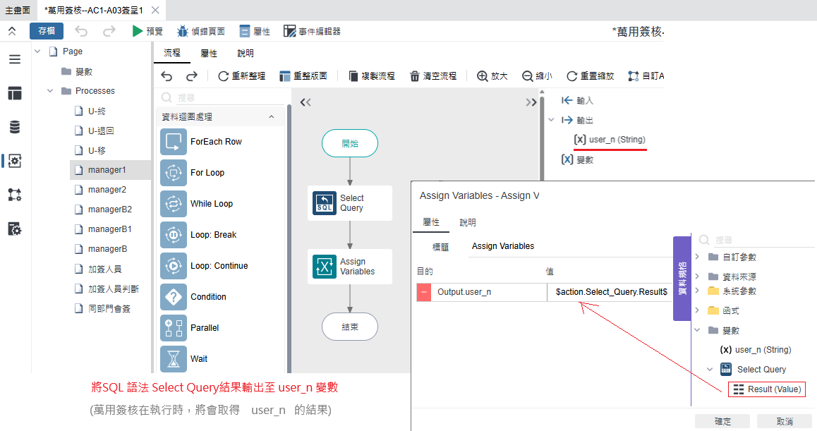 再拖拉[萬用簽核] action,到流程上,並輸入第一步的SQL語法,取得流程會用到的資料