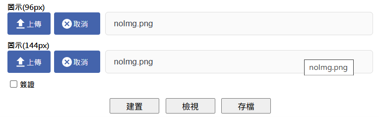 圖示(px):上傳 36、48、72、96、144 尺寸的 App 圖示。