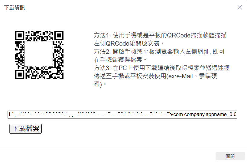 當上方欄位資訊設定完成後,點選上方的【建置】即可開始產出 Android App。完成建置後,點選【檢視】可查看下載資訊,系統提供以下三種下載與安裝方式: