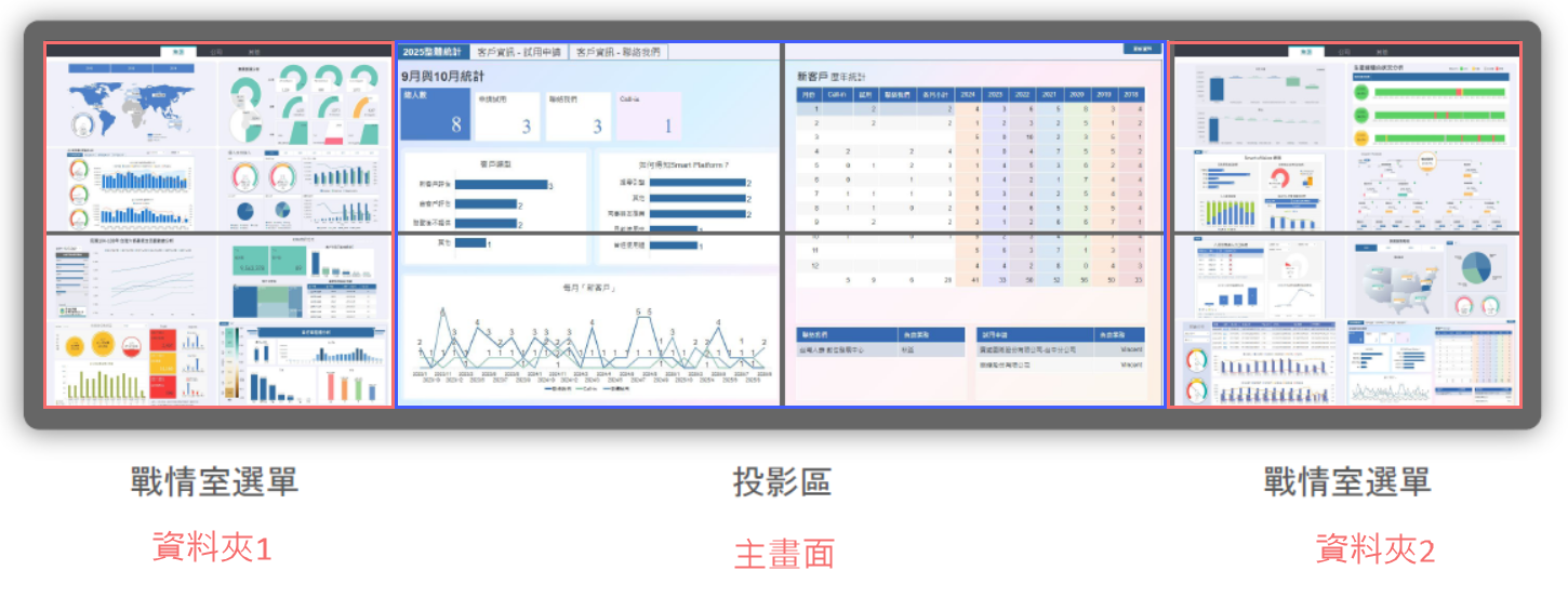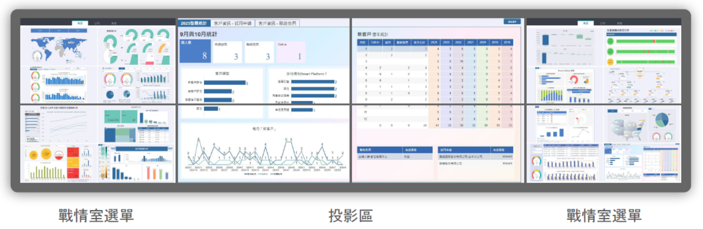 投影區(中間主畫面): 顯示目前選取的儀表板或報表內容, 作為與會人員共同觀看與討論的主要畫面。