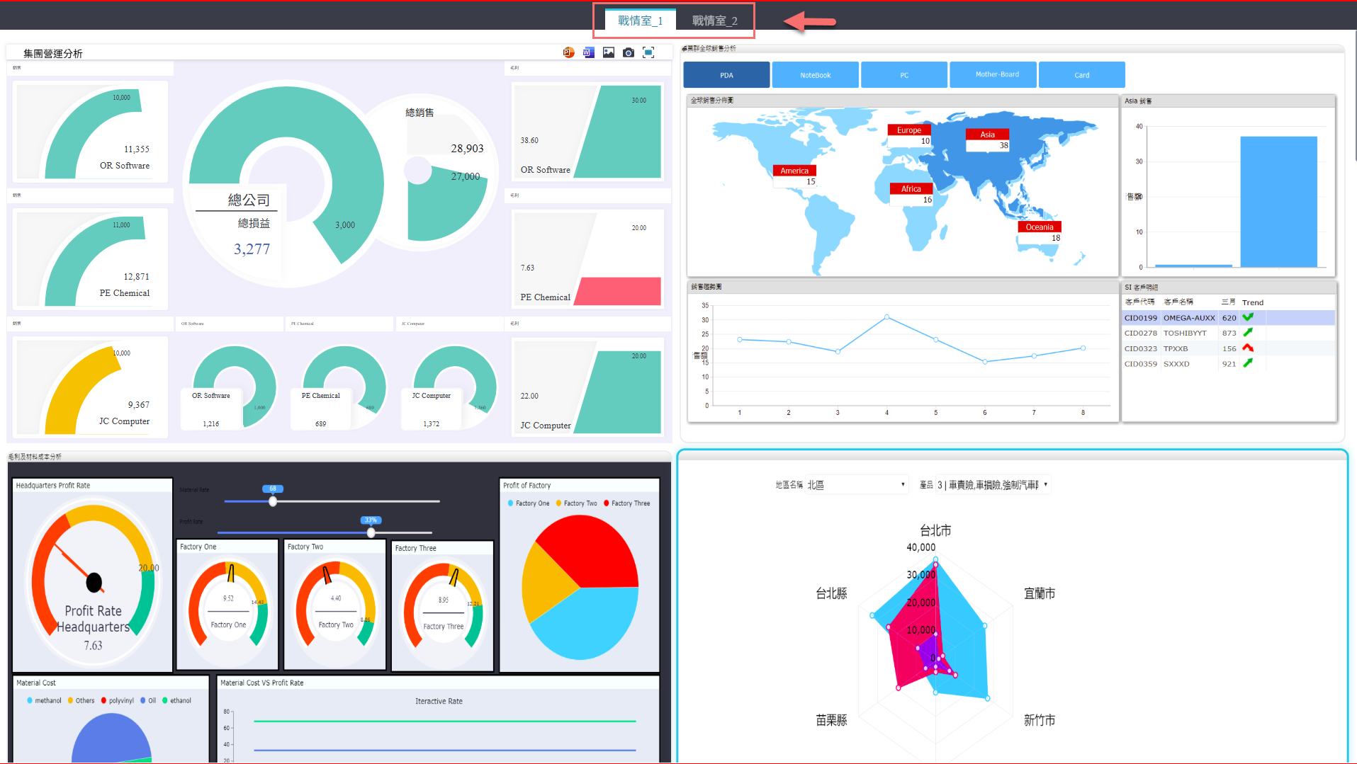 上面螢幕作為戰情室選單,提供快速切換頁面;